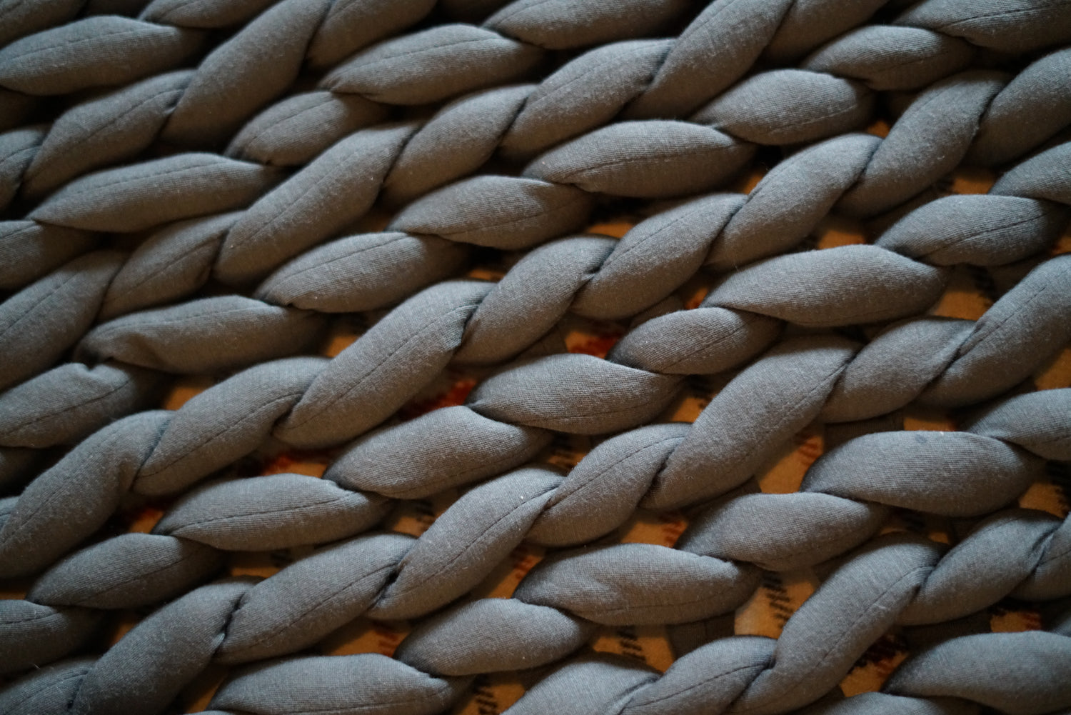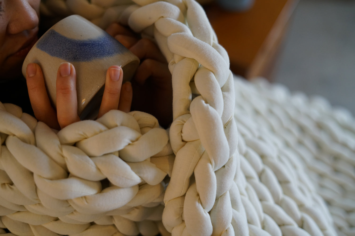 太さや編み目の密度・中綿を調整し、くるまっても中身がかたよらず身体に重みをかけることができます。