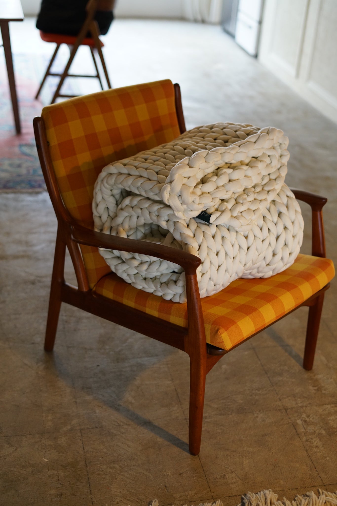 ▷ 掛けたブランケットの両側を脚の下などにくるっと包み込ませるのもクッション感が気持ち良いと好評です。