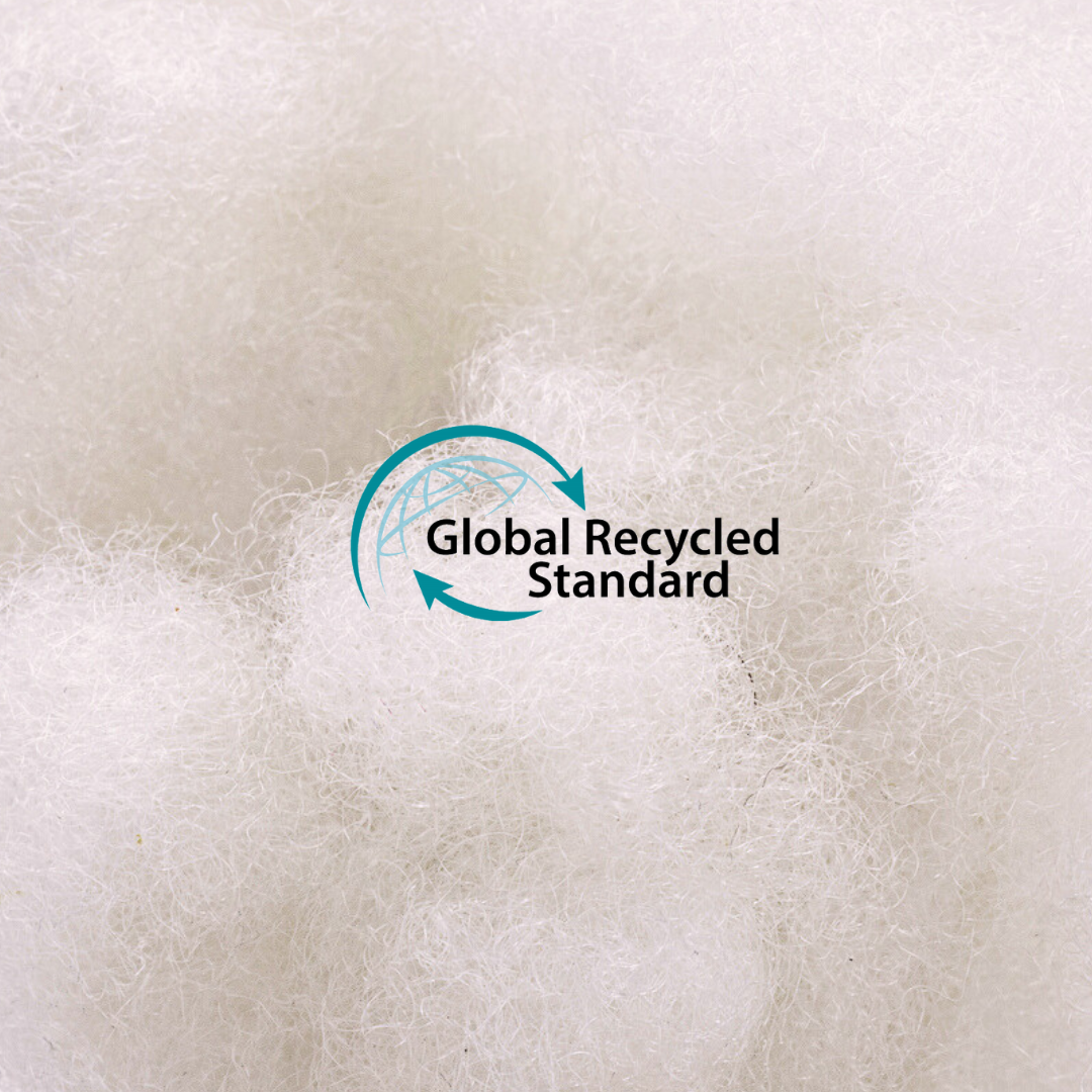 中綿にはリサイクル製品における国際的な基準であるGRS(グローバル・リサイクルド・スタンダード)認証を受けた、ペットボトルなどからリサイクルされた再生ポリエステルを100%使用。