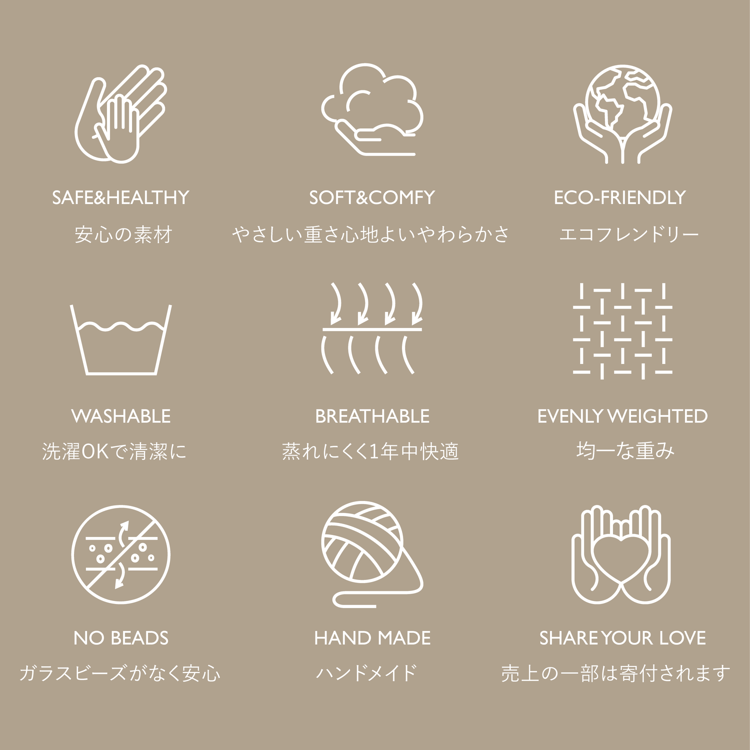 従来の加重ブランケットに詰められるガラスビーズなどは使用していない為、万が一の時もこぼれる心配がありません。